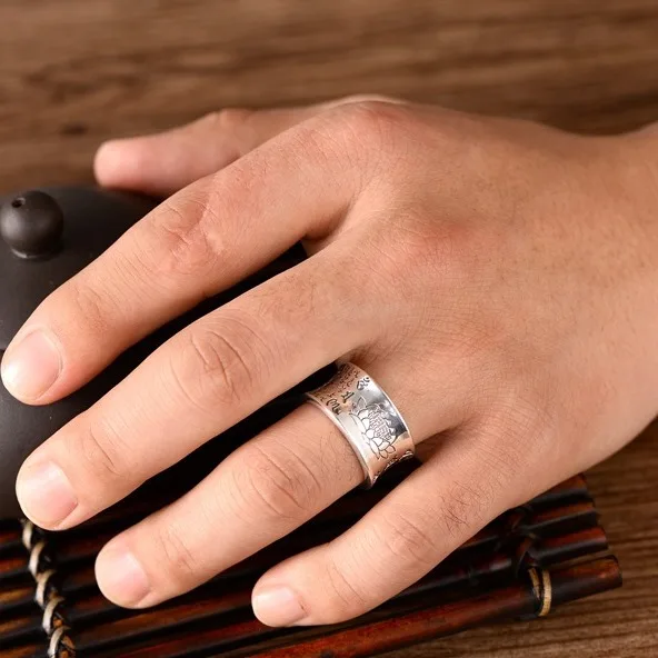 TOP S925 Sterling Silver Rings For Men Women Sutra Six Word Lucky Lotus Ring 8-10